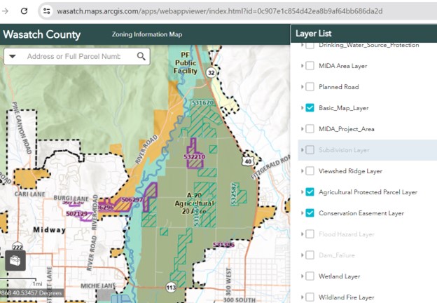 Also the Wasatch County – ‘Zoning Map’ map below shows purple and green ‘hatched’ parcels in the North Fields. The purple ‘hatched’ parcels have Conservation Easement protection agreements. The green ‘hatched’ parcels have the Agricultural Protection Area status.